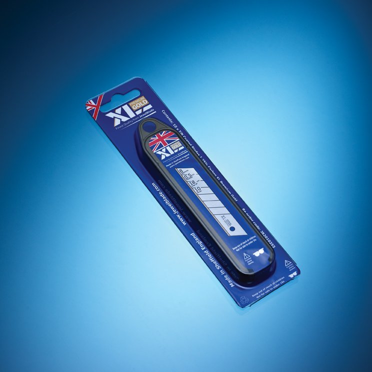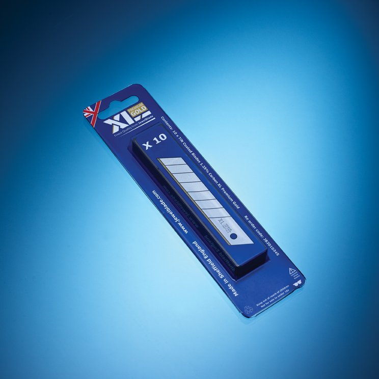 XL Premium Gold 18mm Snap Off Blades With 8 Cutting Segments 0.5mm Thick. Made From High Quality 1.25% Carbon Steel With a Polished Finish Featuring a TiN Coated Cutting Edge. The Titanium Nitride (TiN) Coating improves wear resistance and extends blade life. This is ideal for preventing breaking when cutting through those more abrasive materials.