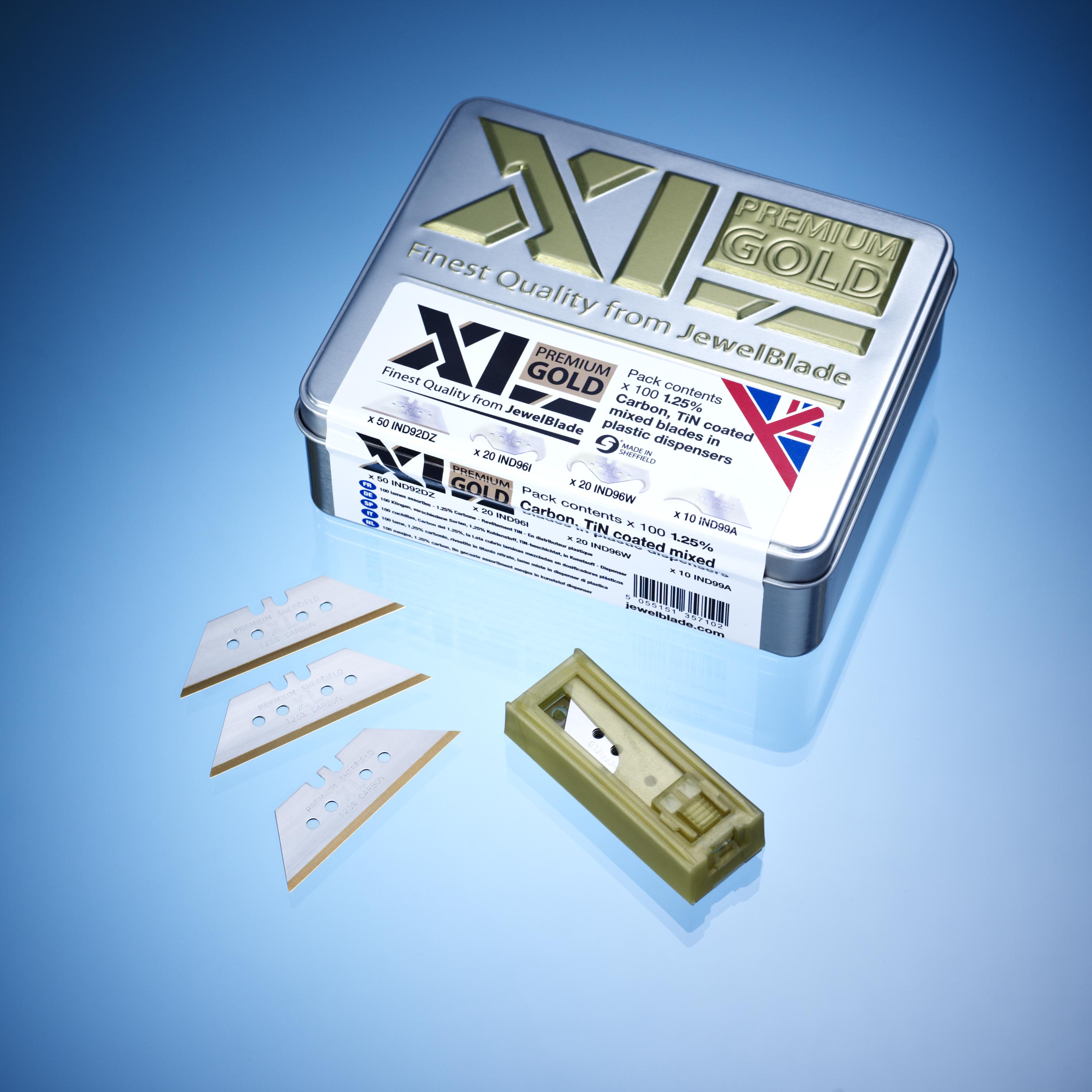 XL Premium Gold Embossed Mixed TiN, Pack Contents Include 100 XL Premium Gold Polished 1.25% Carbon Steel TiN Coated Blades, Packed In Safety Dispensers; 50 x IND92DZ, 20 x IND96I, 20 x IND96W, & 10 x IND99A. Ideal for floor covering professionals when fitting various types of modern day flooring materials such as L.V.T, Underlay, Artificial Turf, Heavy Duty Vinyl and others.